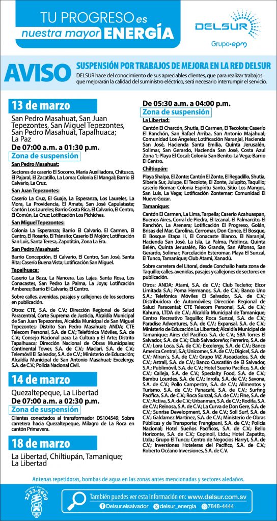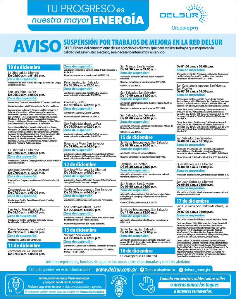 En DELSUR estamos comprometidos con garantizar la salud de nuestros colaboradores y con brindar la continuidad del servicio de energía eléctrica en nuestra zona de operación, que incluye los 82 municipios de los departamentos de La Libertad, San Salvador, San Vicente, Zacatecoluca y La Paz. Acatamos las medidas del gobierno y otras adicionales, con el