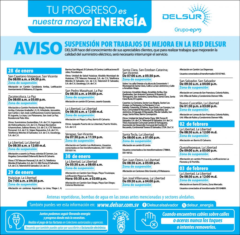 En DELSUR estamos comprometidos con garantizar la salud de nuestros colaboradores y con brindar la continuidad del servicio de energía eléctrica en nuestra zona de operación, que incluye los 82 municipios de los departamentos de La Libertad, San Salvador, San Vicente, Zacatecoluca y La Paz. Acatamos las medidas del gobierno y otras adicionales, con el